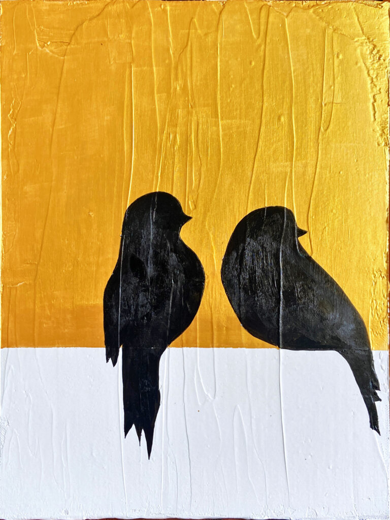 A minimalist acrylic painting featuring two black bird silhouettes on a textured gold and white background. Created using texture techniques to evoke calm, balance, and quiet connection.