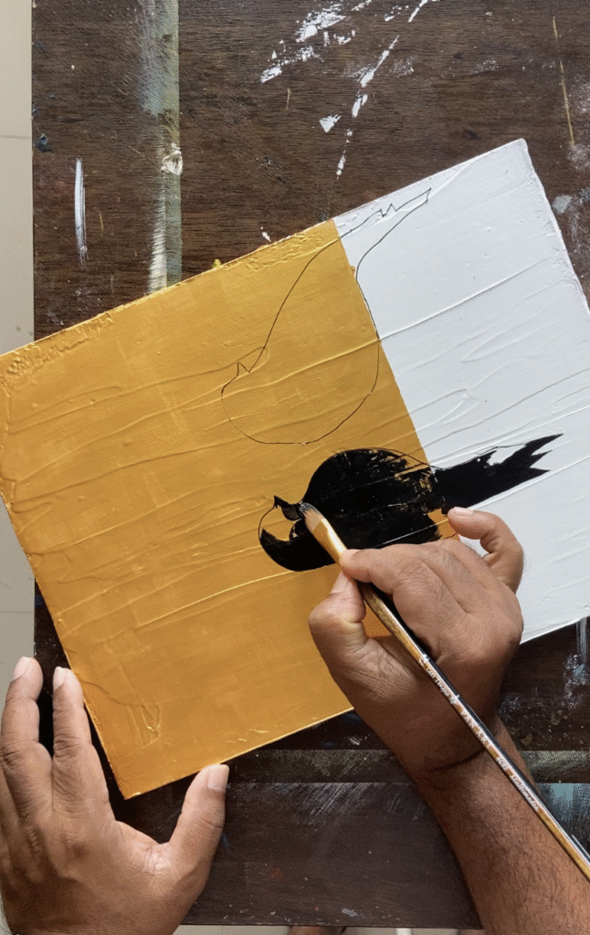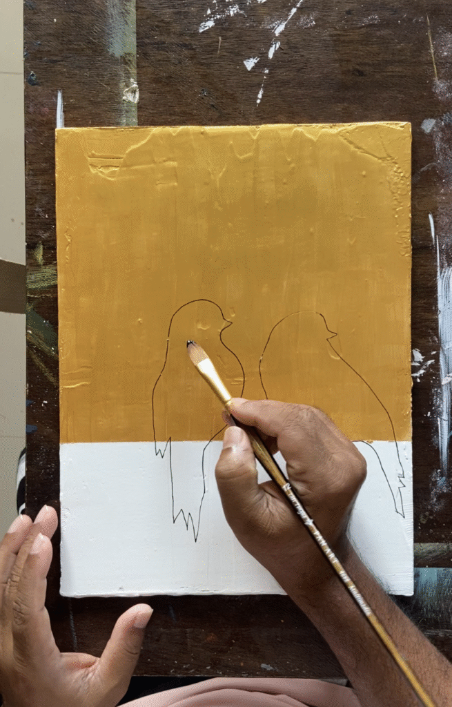 I used a pigment liner to outline the birds, but you can experiment with other tools as well. In my case, while outlining, the wall putty and gold paint started coming off on the tip of the pen. I’m not sure if that means my gold paint hadn’t dried properly. I’d love to hear about your experience if you’ve tried something similar.